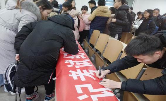 同学们在以诚信考试为主题的横幅上签字
