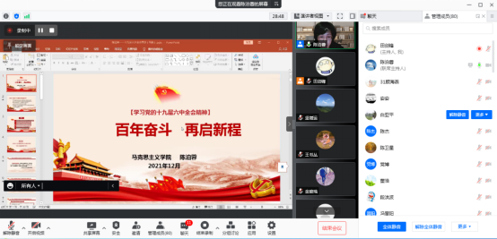 12月22日,按照《williamhill学习贯彻党的十九届六中全会精神宣讲工作方案》及《党的十九届六中全会精神学习宣传方案》文件要求,委邀请校思政课标兵、宣讲团成员陈泊蓉老师为全体教师做题为《百年奋斗,再启新程》的专题宣讲。80余名教师参加了本次线上会议,会议由公司党委书记呼晓青主持。
