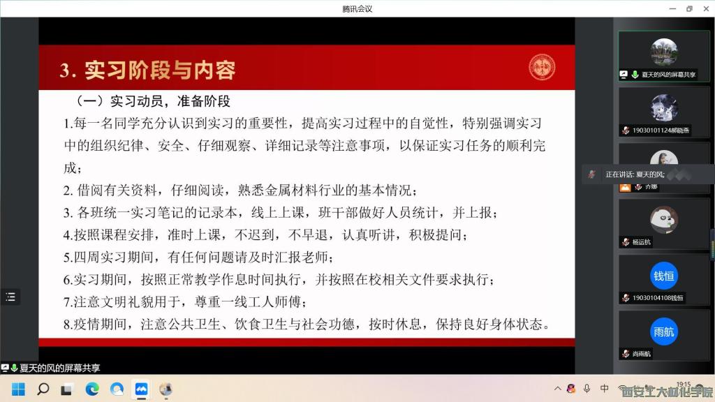 2022年4月8日晚,威廉希尔williamhill通过线上会议的形式举办了2019级金属材料工程专业生产实习动员大会,本次动员大会主要对实习要求以及实习形式做了说明,威廉希尔williamhill教师刘志学、马志军、夏峰和乔娜出席会议,2019级金属材料工程专业全体同学参加会议。