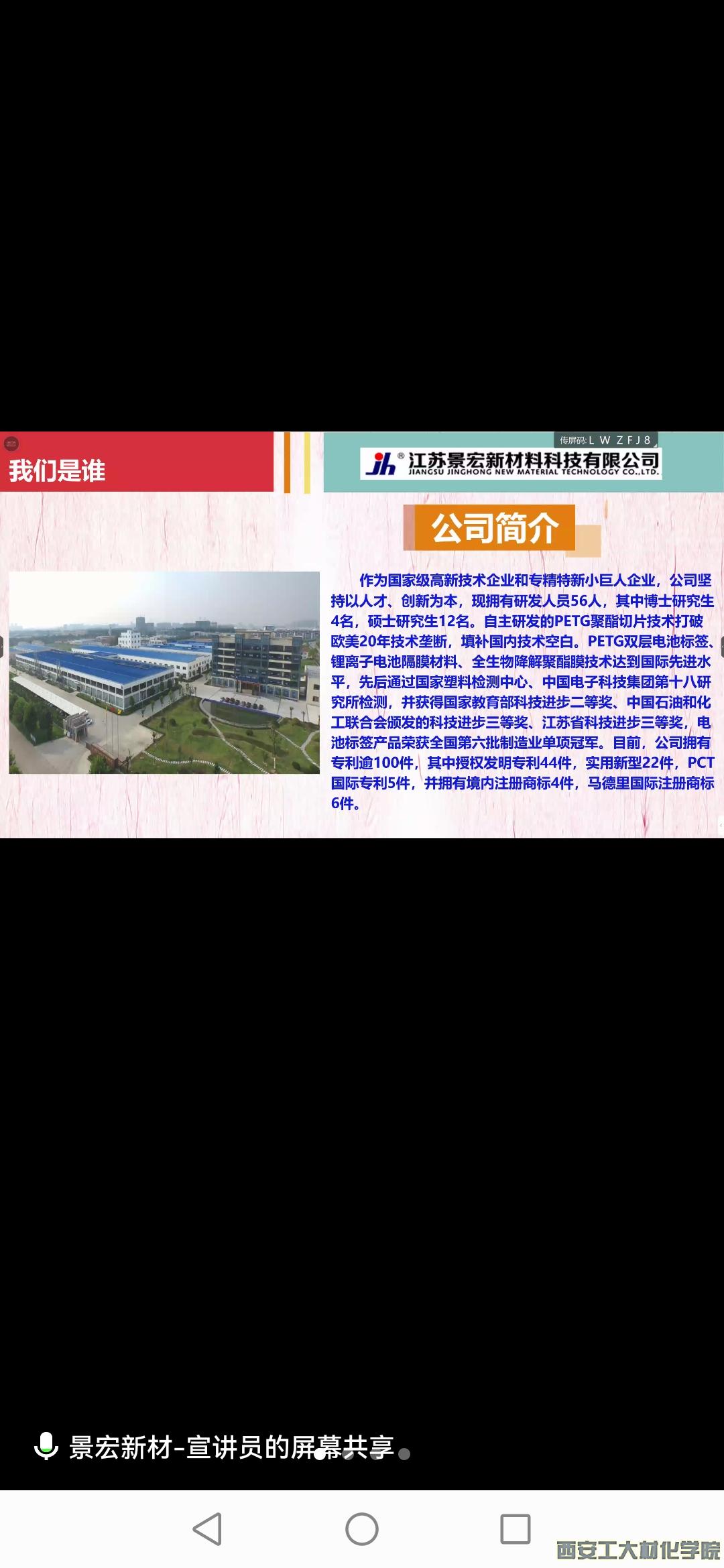 江苏景宏新材料科技有限公司作为全球最大的碱性电池标签供应商,该公司以先进的生产技术,经营理念以及杰出的人才培养方案吸引了众多同学积极参与。江苏景宏新材料有限公司人事部门为同学们介绍了公司详细情况以及规划、发展以及人才引进培养措施等。同时公司副书记陈卫星教授与单位关于产学研、实习其他、人才培养等方面积极沟通。最后,江苏景宏新材料有限公司并对同学们提出的问题耐心做出解释和回答,毕业班辅导员与单位沟通会及时把员工简历推荐给单位,更好提高毕业生就业工作的质效。