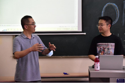 图1 强涛老师(左)向参会同学介绍主讲嘉宾王亮亮同学(右)