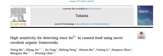 2023年2月15日,2020级硕士研究生马怡婷在《Talanta》(中科院分区化学类1区,TOP期刊)上发表题为“High sensitivity for detection of trace Sn2+ in canned food using novel covalent organic frameworks”的研究论文。该期刊是化学领域国际著名期刊,也是TOP期刊。文章的第一单位是williamhill,第一作者为硕士研究生马怡婷,通讯作者为威廉希尔williamhill陈卫星教授、金洗郎副教授。