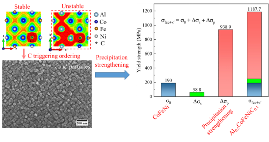 高密度共格纳米相增强FCC基金属材料的简单、低碳制造一直以来是工程界的难点,以往都是采用复杂、高能耗的热机械工艺,且难以获得大体积分数纳米相。对此,高熵合金团队利用掺杂C与Al及过渡元素之间键合作用的巨大差异,而诱导形成反向畴界能高的有序纳米κ′相。基于此,团队采用直接凝固制备纳米κ′相增强高熵合金。该合金纳米κ′相体积分数高达55%,屈服强度达到1.1GPa,其中由纳米κ′相的贡献值接近GPa级,达到0.94GPa。这一成果不仅为纳米共格增强FCC基金属材料提供了一种新型增强相,而且为该类材料的制备提供了新策略,有望实现低碳制造。论文链接:https://doi.org/10.1016/j.mtnano.2023.100331