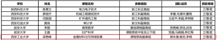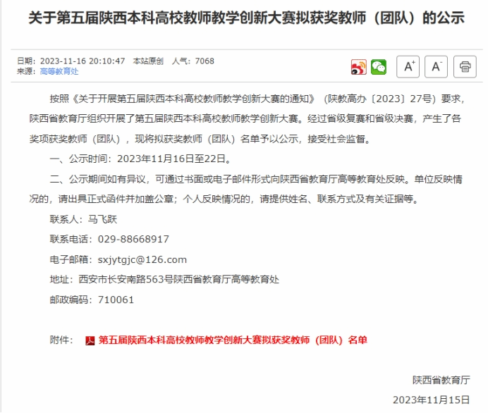 2023年11月16日,陕西省教育厅公布了第五届陕西本科高校教师教学创新大赛获奖教师名单,公司教师罗春燕(团队)获省级一等奖,梁艳峰(团队)获省级三等奖。