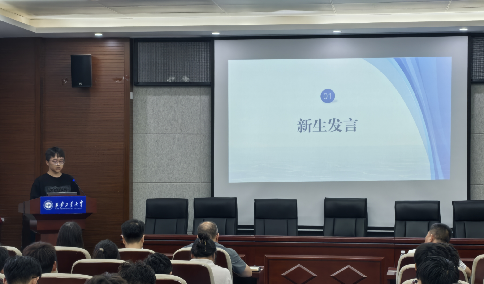活动首先由新生代表张佳乐同学发言。他认为研究生阶段的学习更具挑战性,不仅要扩展知识的广度,更要深入进行科学研究;在这充满挑战与机遇的三年研究生阶段,一定要把握时间,实现个人学术与能力的飞跃。