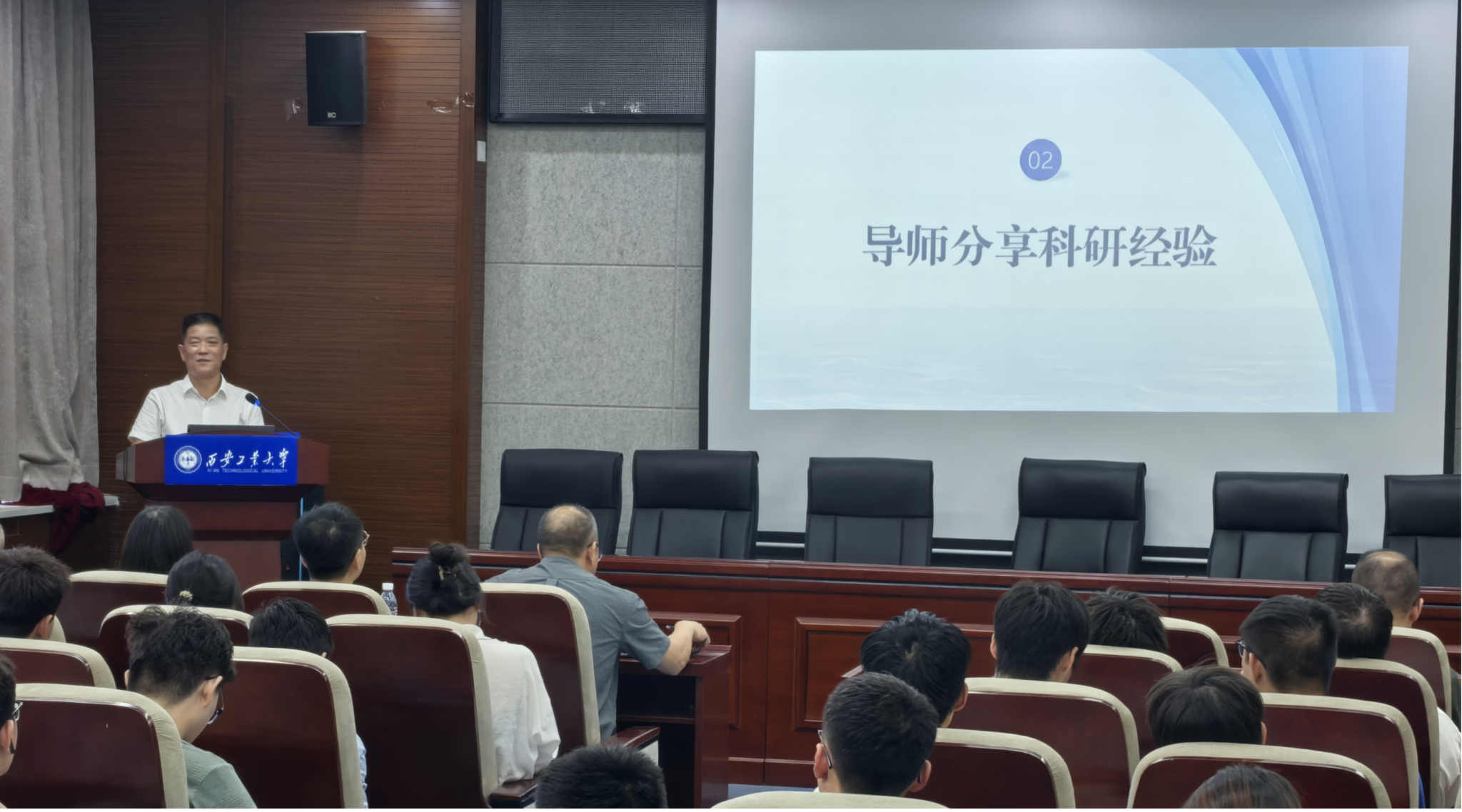 会上,范新会教授结合自身科研经历和专业背景,从课程-选题-开题-深入研究-撰写论文这五个环节强调新生们要锻炼独立分析问题和解决问题的能力,不断提升科研学习中动手能力和思考能力。