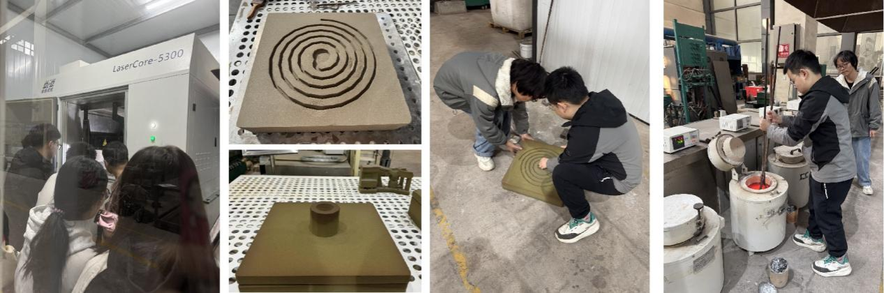 实践环节,同学们亲身体验了砂型3D打印的实际操作流程。从SolidWorks软件构建砂型模具三维模型,精心规划切片与路径,到打印参数的设置与调整,再到借助激光3D打印机将砂粒逐层烧结成型与后处理,每一个环节都在教师的悉心指导下有序进行。随后,员工完成铝液浇铸以测试砂型流动性,全程自主操作,犹如一场科技创新的实战演练,有效提升了他们的综合实践与创新能力。