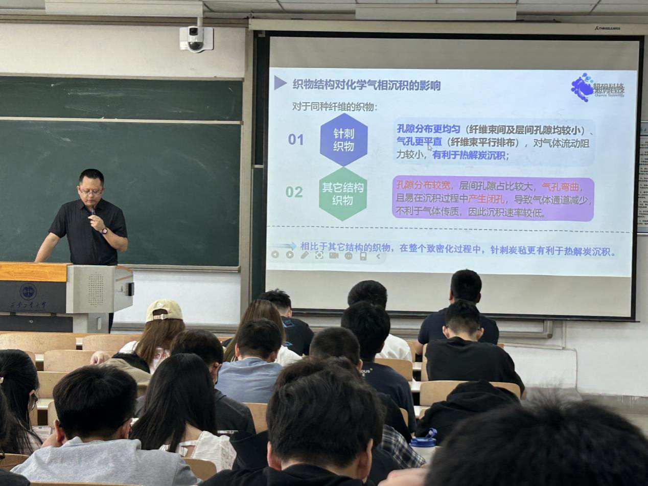 张灵玉高级工程师介绍了先进炭/炭复合材料的研发思路,以飞机刹车盘为例,重点介绍了碳纤维三维立体编织成形,制备碳陶复合摩擦材料的新产品研发、生产及航空制动器的典型应用。期间,张灵玉高级工程师与同学进行了热烈地互动交流,分享了自己从事炭/炭复合材料研发工作多年的研究经验与心得,开拓了员工的学术和工程视野,大家均表示此次学术交流受益匪浅。