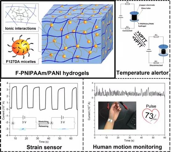上述研究结果已以“Dually Synergetic Network Hydrogels with Integrated Mechanical Stretchability, Thermal Responsiveness, and Electrical Conductivity for Strain Sensors and Temperature Alertors”为题,在线发表于《ACS Applied Materials & Interfaces》上。