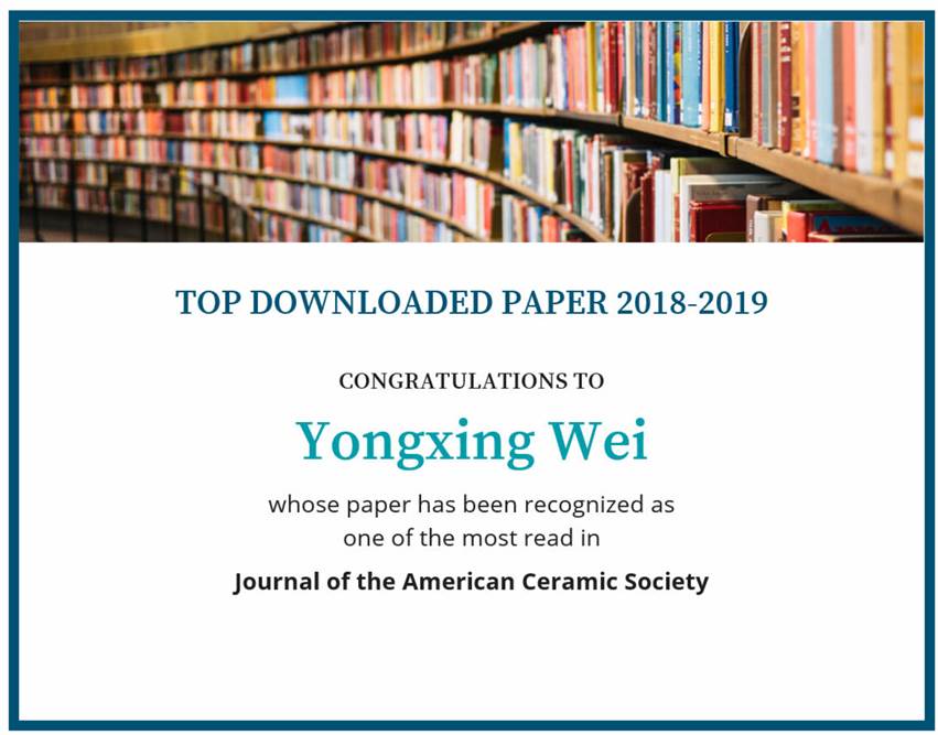 近日,威廉希尔williamhill教师魏永星为第一作者发表的学术论文:Bi0.5K0.5TiO3–CaTiO3 ceramics: Appearance of the pseudocubic structure and ferroelectric‐relaxor transition characters, Journal of the American Ceramic Society, 2019, 102: 3598-3608入选国际陶瓷学科顶级期刊Journal of the American Ceramic Society前10%最大下载量论文(top 10% most downloaded papers)。这意味着2018年1月至2019年12月在该期刊发表的所有学术论文中,该学术论文是一年周期内最大下载量和阅读量论文之一。