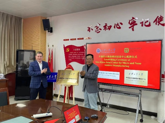 国际交流与对外合作处处长张冬敏介绍中俄合作情况,表示公司从2018年开始与俄罗斯圣彼得堡彼得大帝理工大学进行学术上的交流。惠增哲经理与Anton A. Naumov共同为中俄联合微纳增材制造中心揭牌。