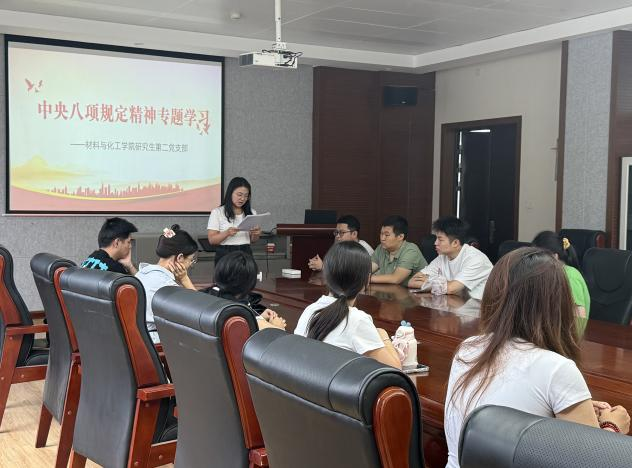 学习会上,纪律委员魏艳婷围绕中央八项规定的主要内容、实践意义、时代价值与制度创新四个维度展开讲解,结合研究生学习生活实际,重点解析中央八项规定对改进学术作风、精简科研活动等方面的现实指导意义,并引导党员结合自身经历,就“如何在日常学习生活中贯彻落实中央八项规定精神”展开心得交流。
