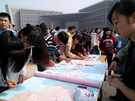 活动现场进行的主要项目是拼地图。同学们拼好地图后需要在地图上为自己的家乡涂上喜欢的颜色,并在横幅上签下自己名字,为自己的家乡送上最真挚的祝福。现场进行的拼地图活动热烈精彩,同学们绞尽脑汁并与队友竭力合作,他们争取在最短时间内完成拼图。同时,在活动现场由已进入秀家乡决赛的同学们晒出的家乡风景照更是美不胜收,引来围观同学们一阵阵的惊叹与赞美。而正在绘地图的现场更是挤满了观众,当大家都在为自己的家乡填上靓丽的色彩时,我们深刻的体会到了同学们对自己家乡的浓浓爱意。活动现场井然有序,热闹非凡。