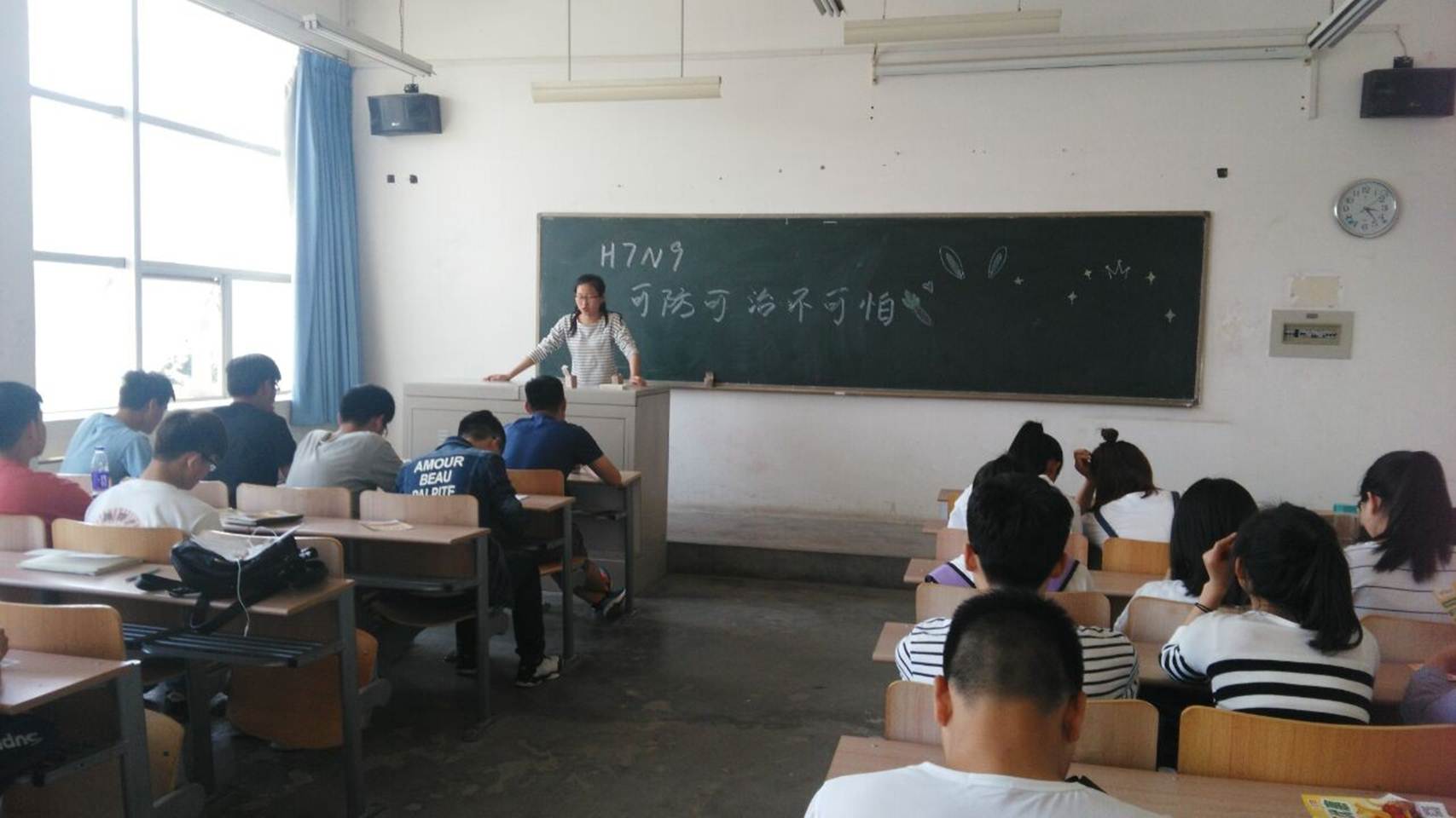 “H7N9可防不可怕”主题团日活动共分三个环节进行:首先是团委秘书部长陈妍妍上台讲解,针对这次会议的主题,陈妍妍向大家介绍了近期H7N9全国病例的案例,也向所有团员去叙述了有关病毒传染的相关知识理论。紧接着团支书齐梦媛为大家讲解疾病预防,疾病症状,传播途径等等,所有的团员在讲解中都认真的去听和思考,时不时也去提出问题,由团支书带领大家一起讨论,团支书齐梦媛提出只要注意疾病预防,了解疾病特征,那么流感并不可怕,希望同学们一如既往,调动最大的热情投身于学习中,并且团支书分析支部同学们生活方面存在的不好习惯,团支书给大家建议多运动,跑步可以强身健体并且增加同学对疾病的抵抗能力,解决大家体质越来越差的问题。最后会议在热烈的交流氛围中,主题活动走向尾声。