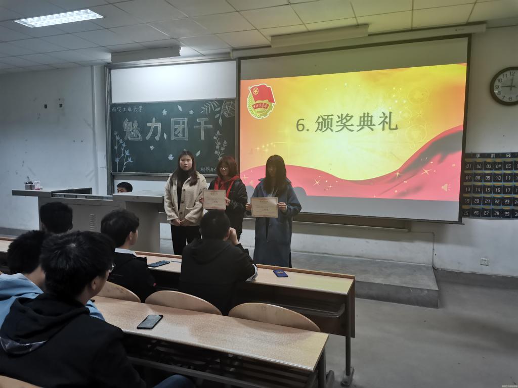 本次活动由策创部干事史林烨和候鹏辉主持。活动开始,由主持人隆重介绍各位评委并表示热烈的欢迎。随后,各班团干部依次上台展示参赛视频和自身对团干工作的见解和收获,同时进行才艺表演。视频内容丰富多样,介绍团日活动、我与西工及西安城墙等。才艺表演时,各个团干充分展示了自身的魅力与才华,如魔方表演、唱歌及诗朗诵等,从方方面面展现了身为团干部的模范先锋作用。选手展示完毕后,全体成员观看了共青团公开课,进一步的了解到共青团的历史与风采。最后,公司2019级员工王若贤荣获本次比赛第一名,刘宇宇,崔卓阳同学获得第二名,张悦,李悦,赵倩倩同学获得第三名,同时邀请评委为获奖的团干颁发证书并合影留念。至此,本次活动圆满结束。