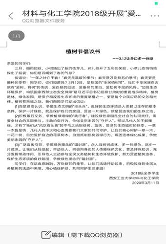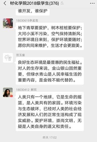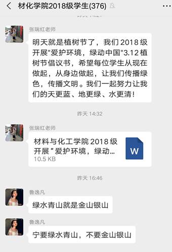 植树节来临之际,在2018级辅导员张瑞红老师组织下全体18级员工认真阅读了关于“爱护环境 绿动中国”植树节活动倡议书,并在年级群上积极发言。同学们纷纷表示:植树造林保护了我们赖以生存的环境,不仅可以绿化和美化家园,同时还可以起到扩大山林资源、防止水土流失、保护农田、调节气候、促进经济发展等作用,是一项利于当代、造福子孙的宏伟工程。“植”入绿色,“树”立希望,“造”福子孙,“林”荫后人。迎着和煦的春风,迈着轻快的脚步,让我们一起行动吧。活动最后由辅导员张瑞红老师进行总结她道:即使我们目前处于疫情期间但植树节传统不能忘,希望每位员工从现在做起,从身边做起,让我们传播绿色,传播文明。我们一起努力让我们的天更蓝、地更绿、水更清!