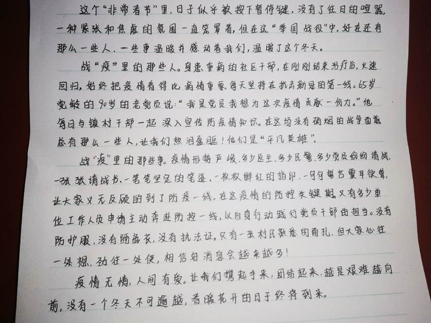 同学们积极响应国家号召,在做好居家隔离的同时认真落实公司“停课不停学”的具体要求,认真开展线上专业课知识学习及雷锋月主题学习活动。为更好地传承雷锋精神,同学们在家中融情于文字,弘扬雷锋的奉献精神、抒发对英雄们在抗击疫情中大无畏精神的敬佩,表达当代老员工共同抗击疫情的决心。公司全体团学干部纷纷拿起手中的笔,化文字为斗争力量,与奋战在一线的英雄们共同抗击疫情。正如同学们文章中所说那样在此次抗击新冠肺炎的战场上,没有人是孤军奋战,惟其14亿中国同胞勇毅、同心,才能势不可挡、战无不胜。