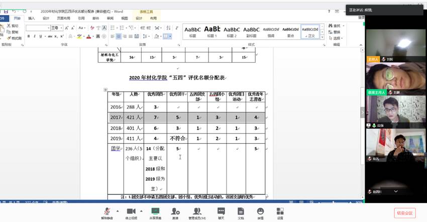 首先,段老师结合公司的文件表彰内容给大家做了详细的分类说明,并提出了每个奖项的个人和集体要求和申请条件,引导班干部要注重优秀青年员工和干部等方面的挖掘。其次,段老师也强调关于志愿者方面与往年的不同,针对疫情期间做出突出贡献的青年志愿者,一定要深入挖掘出来,根据团支部的民主评议,进行个人奖项的申报等等。针对此次五四评优工作,段老师也讲解可能出现的问题,以及相应的解决方法,通过文件的解读及安排,员工干部更加明确本次评优工作的重心及意义。最后,段老师就员工干部在疫情期间对班级的管理方面提出要求:及时了解班级员工的位置动态、每天掌握员工的线上学习情况以及班级在大三阶段常出现的问题等等。