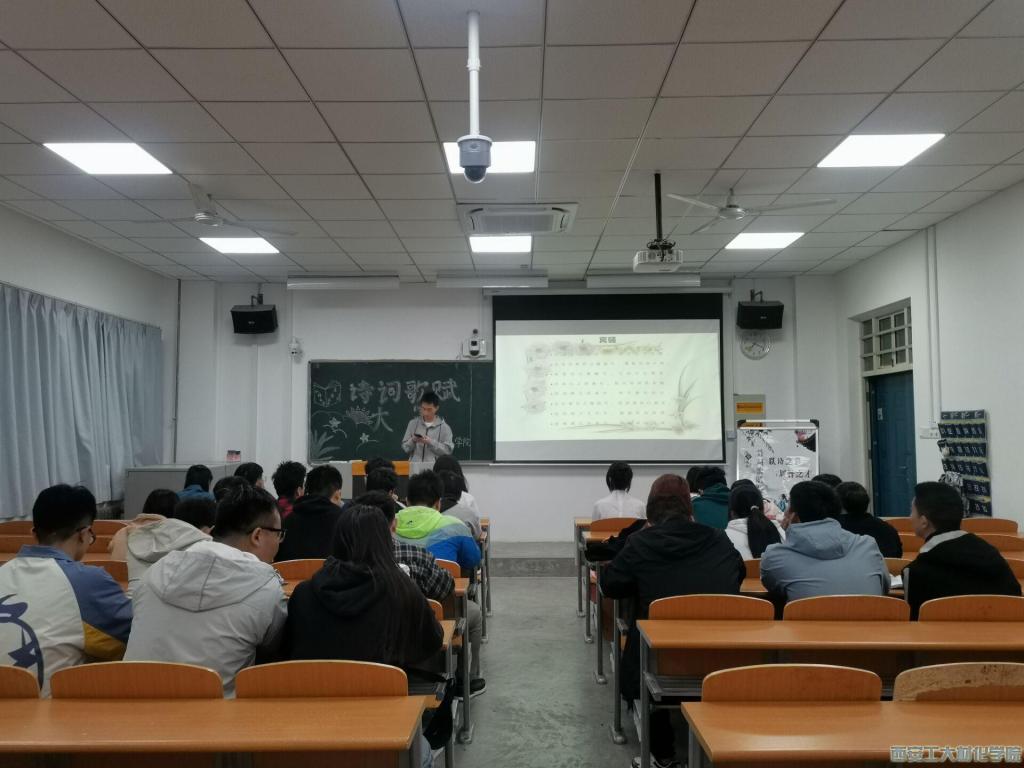 本次活动由线上答题与现场朗诵两部分组成,于2021年4月1日22点-22点30举办了线上初赛,由员工干部统计答题成绩并公布复赛名单后,2021年4月7日19点在教三-201举办线下晋级赛。员工干部延涵冰,欧阳雪芝,余光浩,张盛辰,房双双等作为评为出席了此次活动。本次活动由员工干部郑磊主持,宣布活动开始后,参赛选手依次朗诵诗词歌赋,并结合PPT讲解诗词中所表达的含义。选手们丰富的知识储备与隐健的台风赢得了台下观众的掌声。通过评委打分,评比出一等奖、二等奖、三等奖,三组选手。在获奖选手与评委合影留念后活动圆满结束。