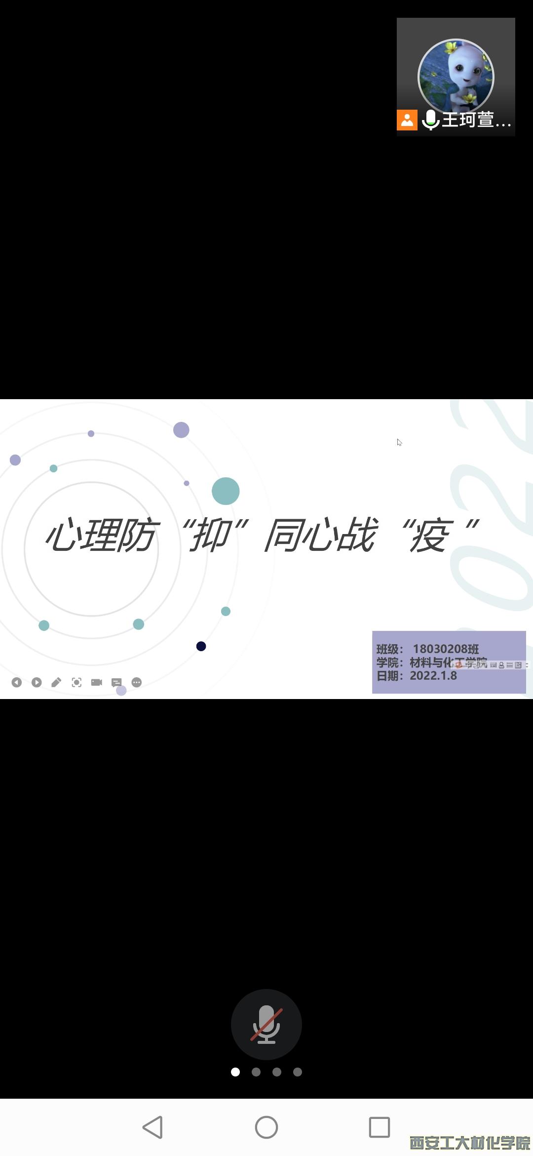 2021年12月底以来,西安新冠肺炎疫情防控呈现新的严峻形势。为进一步落实立德树人根本任务,培养当代老员工的责任担当和家国情怀,在疫情防控期间加强思想政治教育的同时注重员工心理健康,威廉希尔williamhill18030208班于2022年1月8日晚上20点在腾讯会议开展心理防“抑”,同心战“疫”线上主题班会活动,2018级辅导员张瑞红老师和18030208班全体同学参与此次活动。班会在辅导员张瑞红老师的指导和各个班委共同协调下顺利进行。
