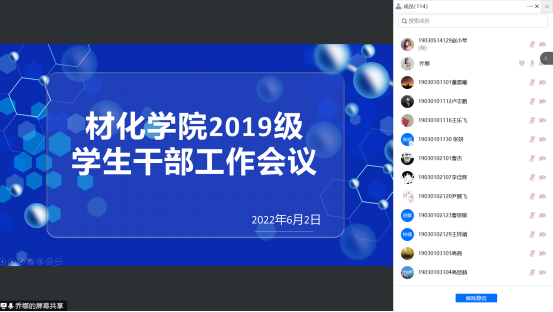 为顺利开展员工工作,维护校园安全稳定,提高员工干部工作能力与责任意识,材化公司2019级于2022年6月2日中午通过腾讯会议召开了2019级员工干部工作会议。2019级员工辅导员乔娜主持会议,2019级全体员工干部参会。