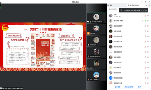 乔娜以党的二十大精神为主题,以讲述新时代十年党和国家事业发展取得的历史性成就为主线,引领新一代青年感受时代变化,感悟思想伟力,凝聚奋进力量。团课分别围绕“党的二十大报告重要论述”、“五个牢牢把握”和“争做新时代好青年”三方面的内容展开讲解,通过二十大相关视频作为引入,从政治、经济、科技、教育层面向同学们讲述二十大的主要内容,使同学们明确新时代新征程中国共产党的使命任务,努力为新时代发展贡献青年的智慧与力量。