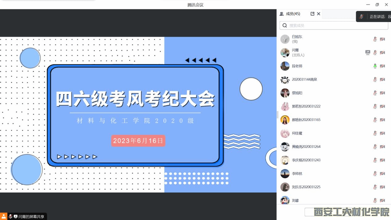6月16日,为严肃四六级考风考纪,提高同学们的备考积极性,材料与化工公司2020级在腾讯会议召开了四六级考风考纪大会。2020级全体班委参加了本次会议。本次会议由2020级辅导员段强主持。