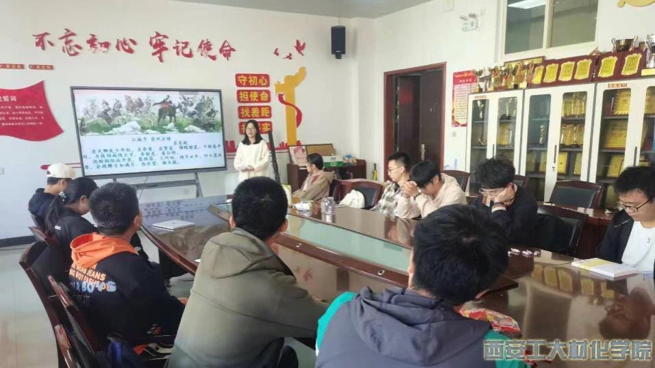 活动开始,由辅导员老师张瑞红向全体同学进行爱国主义思想教育工作,她指出:爱国主义是推动中国社会前进的巨大力量,作为新时代的新青年,应当脚踏实地提升自己的专业素养,有一颗诚挚的报国心。接下来,由郑梦瑶等同学进行了国学经典诵读与解说,全体同学更加深入地学习了《破阵子》、《江城子》、《少年中国说》等经典诗歌。活动最后,由班长李海涛同学进行总结发言,鼓励同学们积极学习爱国经典诗词,坚定文化自信。