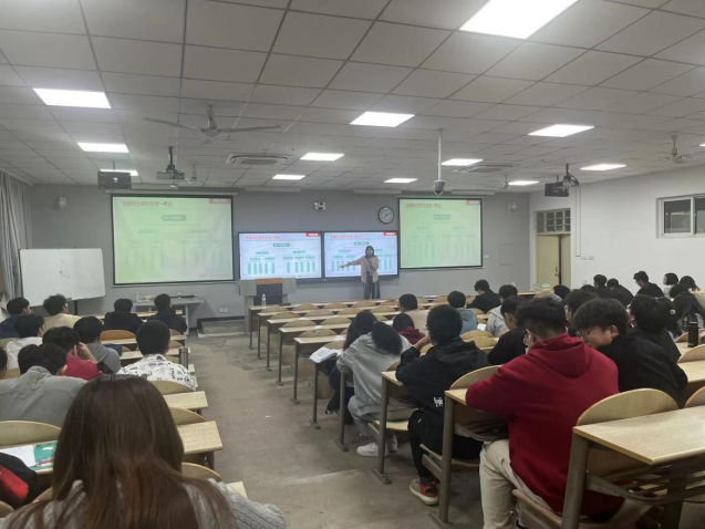 讲座中,主讲教师从考研形势分析、考研目的、院校选择及备考规划等方面进行讲解。她表示随着本科教育的普及,国内本科生比例逐渐递增,本科教育已不再是“精英教育”。在对考研科目进行分析时,主讲教师就历年考研真题进行整合并总结各科学习重点,同时向同学们介绍学科门类的划分。她强调,对于考研目标公司与专业的选择要提前制定,精准把握,慎重选择院校与专业,切勿眼高手低、好高骛远。