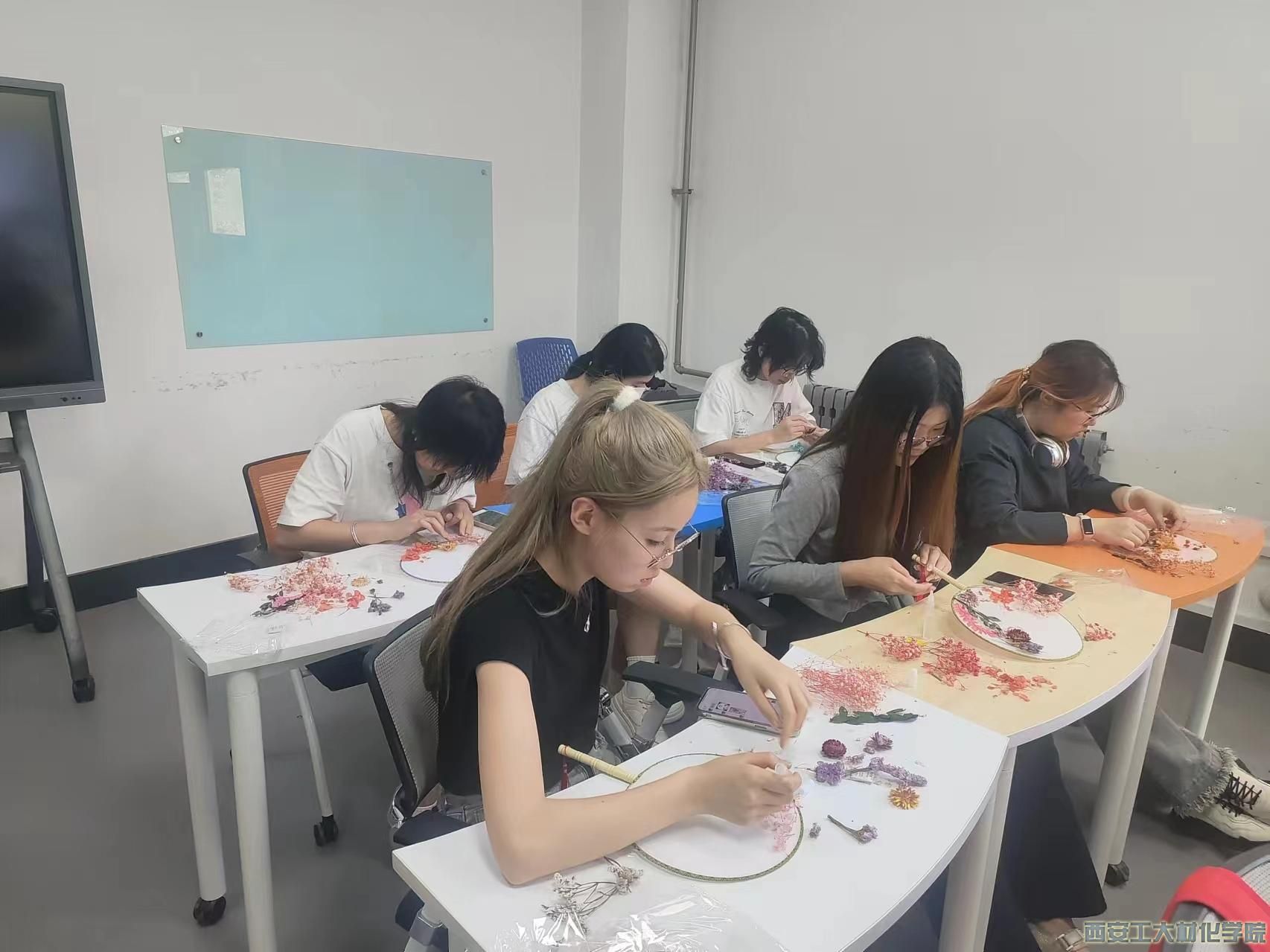活动伊始,员工干部王国庆通过文字和图片相结合的形式介绍了团扇的文化背景和制作方法。随后大家挑选好自己喜欢的干花、空白扇子等制作材料,慢慢摸索、细细构图。活动现场弥漫着浓厚的创作热情,几片叶子、数朵干花,几经摆弄,细心粘贴,一幅幅充满创意的作品跃然扇上,素雅的团扇在大家手中重新焕发生机,被赋予了与众不同的意义。在展示环节,同学们与亲手制作的干花团扇争相合影,如花人生,美丽相伴。
