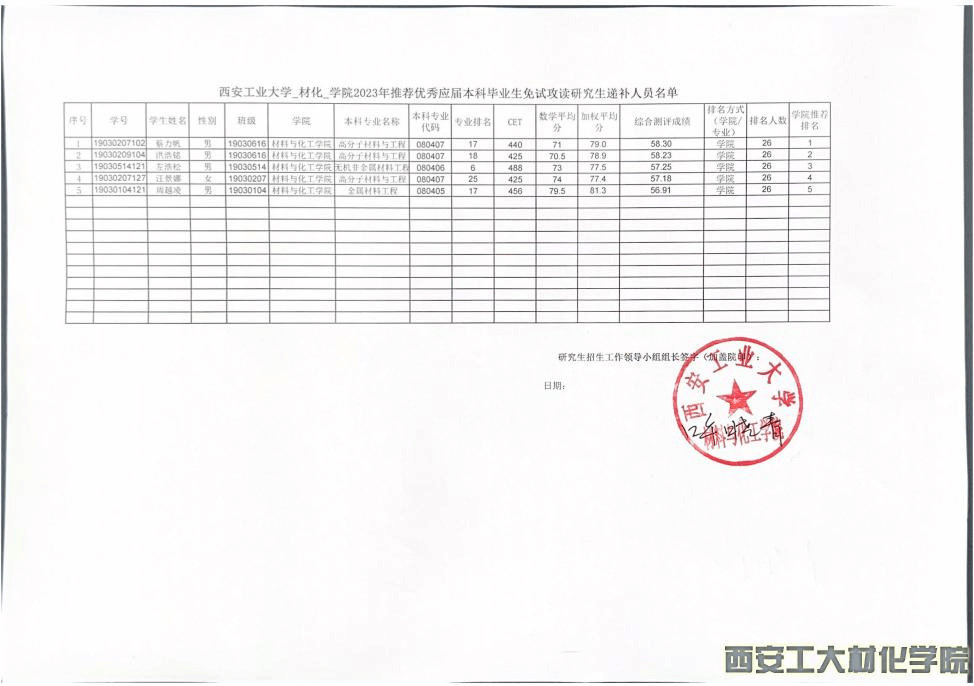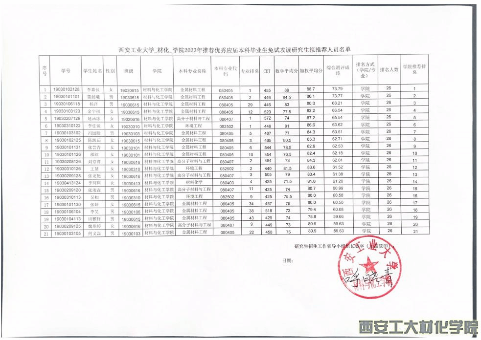 按照《williamhill推荐(接收)优秀应届本科毕业生免试攻读研究生实施办法(修订)》及《2023年威廉希尔williamhill推荐williamhill应届本科毕业生免试攻读硕士学位实施细则》,现将2023年推荐优秀应届本科毕业生免试攻读研究生拟推荐人员名单和递补名单予以公示,公示期为2022年9月17日-23日。如有异议,请于2022年9月23日18时前实名向公司联系人反馈,联系人:胡娜 联系电话:029-86173324。