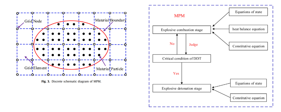 本研究在物质点法的基础上,利用热平衡方程、JWL方程、Virial方程和Lee-Tarver方程建立了炸药在复杂条件下的DDT数值模型。该模型描述了炸药的燃烧反应和爆轰反应,并考虑了约束条件对炸药DDT过程的影响。同时给出了炸药的DDT临界条件和炸药爆轰反应起始位置的判断方法。