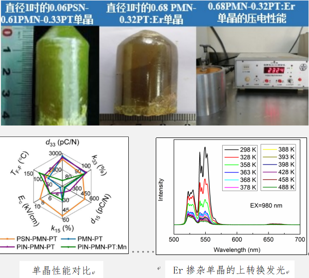 成功生长出直径1吋、2吋、综合性能优异的PSN-PMN-PT单晶和兼具铁电与上/下转换发光特性的稀土掺杂PMN-PT单晶,为新一代换能器、执行器、传感器、红外夜视仪、红外探测装备、短波长激光器的研制提供了关键材料和技术保障。